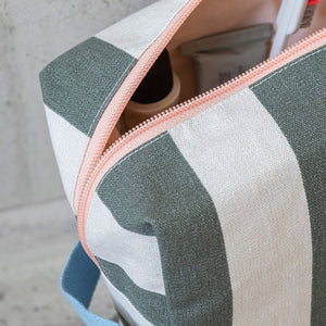 BRING-IT snyrtitöskurnar frá Mette Ditmer eru tilvaldar til notkunar heima eða á ferðinni. Þær eru úr endingargóðu bómullarefni. Innra byrðið er fóðrað með daufbleikri bómull og eru með fjórum hagnýtum vösum til að halda hárspennum, varasalva eða fylgihlutum snyrtilega skipulögðum. Fóðrið er meðhöndlað með óhreininda- og vatnsfráhrindandi húð til að auðvelda þrif. Fjarlægjanlegur botninn heldur töskunni uppréttri og breiður rennilás gerir kleift að nálgast innihaldið auðveldlega.