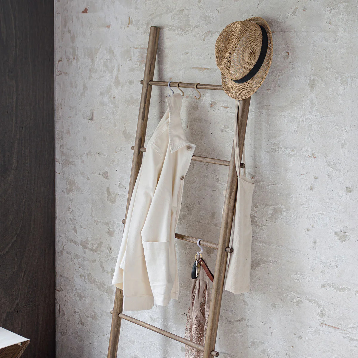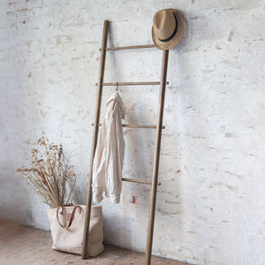 The ROOTS ladder shelf is a sleek and decorative storage solution crafted from dark-oiled solid pine. It fits seamlessly into kitchens, bathrooms, wardrobes, or bedrooms. Use it to hang clothes, towels, or tea towels and enhance its functionality with s-hooks and baskets for additional storage options.