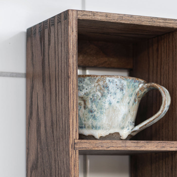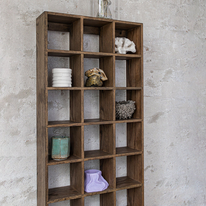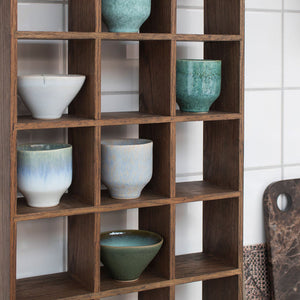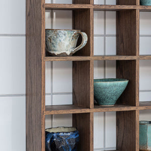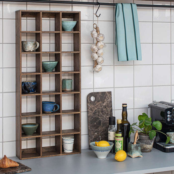 The large SHOWCASE set box from Mette Ditmer combines timeless design with practical functionality. Crafted from dark oiled oak with finger-jointed details, it brings warmth and character to your home. With 21 square rooms, it offers ample space to showcase everything from favourite mugs to keepsakes, souvenirs, or children's creations.