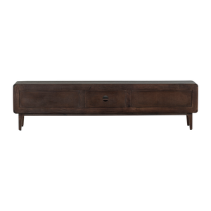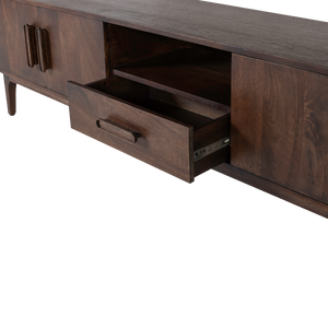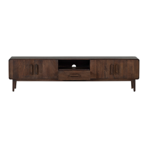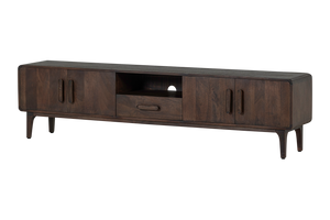 Liya sjónvarpsskenkurinn frá hollenska hönnunarmerkinu WOOOD. Dökkbrúni mangóviðurinn veitir náttúrulega hlýju og andrúmsloft.