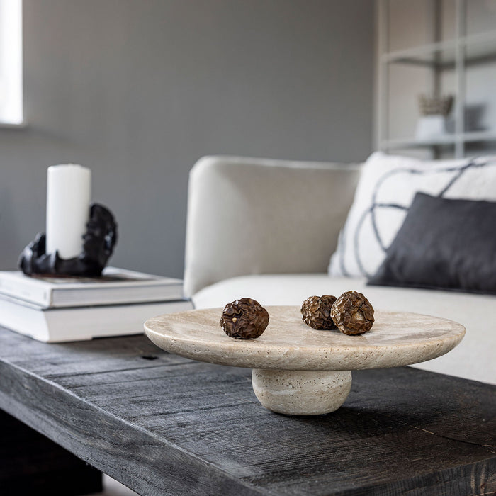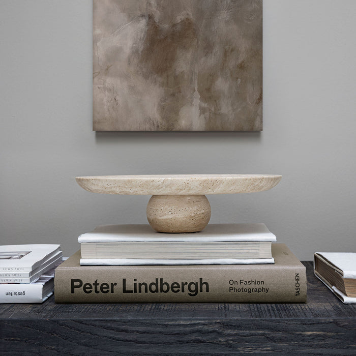 The TRAVERTINE pedestal is crafted from natural travertine stone and adds sculptural elegance to the interior. Its softly rounded plate rests on a distinctly curved base, creating a calm and harmonious silhouette. Each pedestal is unique, revealing the characteristic pores and natural variations of the travertine. Use it as a decorative centrepiece on a coffee table, console, or dining table – either alone or as part of a curated still life arrangement. The matte surface and warm beige tone emphasise the organic texture of the stone, making the pedestal a timeless design element in both classic and contemporary spaces.