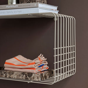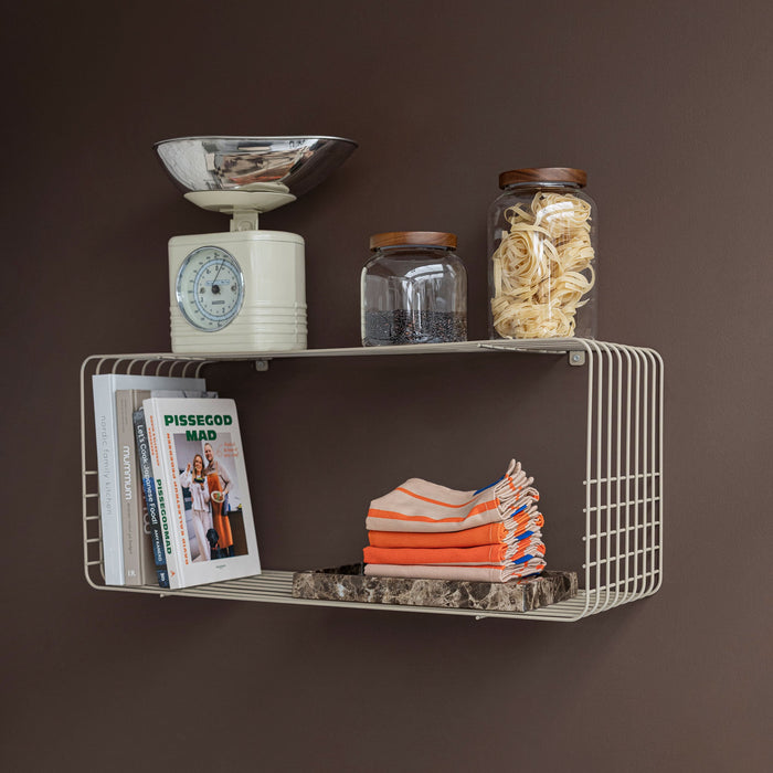 WIRE rack in sand is a versatile storage solution with a matte finish and a calm, modern expression. The soft, warm tone gives the design a light and refined presence, whether used in the hallway, kitchen or bathroom. It can be wall-mounted or placed directly on the floor, depending on your space and needs. Use it for shoes and baskets, folded towels or kitchen essentials. WIRE rack works beautifully on its own, but several racks can also be combined to create a larger and cohesive storage display. For extra stability, we recommend using wall plugs when mounting on the wall. Feet and assembly brackets included. The rack can hold up to 5 kg.
